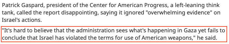 “報告中確實說,可以合理認定以色列在違反國際人道主義法的行動中使用了美制武器,但報告卻不明確說以色列違反了國際人道主義法?!?/p>