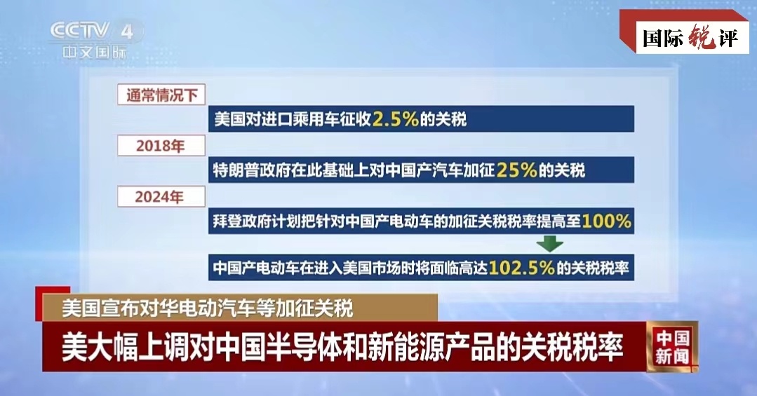 2018年3月,美國時(shí)任特朗普政府依據(jù)所謂“301調(diào)查”挑起對華貿(mào)易戰(zhàn),先后對約3600億美元中國輸美商品加征高額關(guān)稅。2022年5月,在四年期對華加征關(guān)稅行動(dòng)到期前,拜登政府宣布啟動(dòng)相關(guān)復(fù)審程序。當(dāng)?shù)貢r(shí)間14日,美方發(fā)布了復(fù)審結(jié)果,宣布進(jìn)一步提高對華關(guān)稅,涉及商品包括以電動(dòng)汽車、鋰電池、光伏產(chǎn)品為代表的中國“新三樣”,以及關(guān)鍵礦產(chǎn)、半導(dǎo)體、鋼鋁、港口起重機(jī)、個(gè)人防護(hù)裝備等。