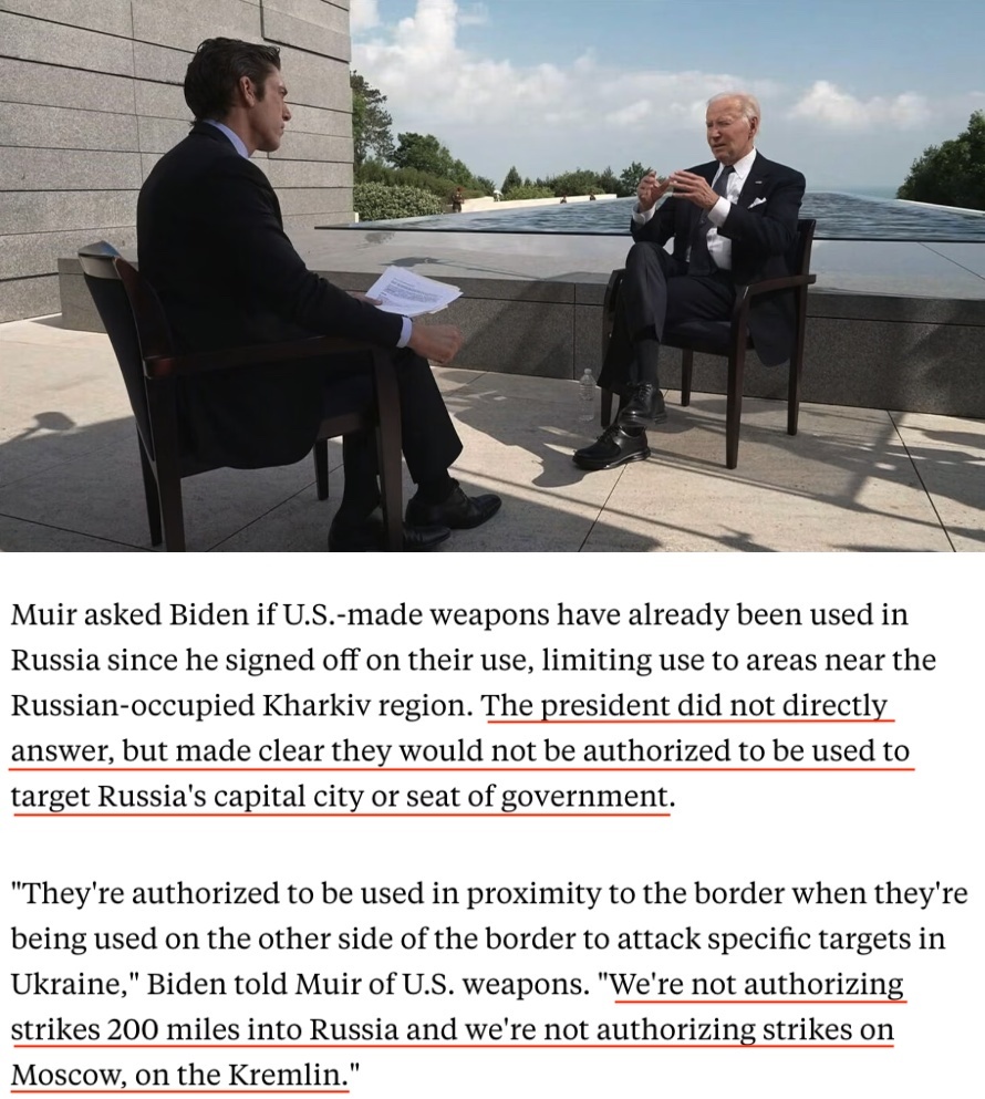 不過,拜登沒有直接回答“美國供烏武器是否被用于打擊俄本土目標(biāo)”,只是表示,不會(huì)授權(quán)烏軍使用這些武器襲擊俄羅斯首都或政府所在地。