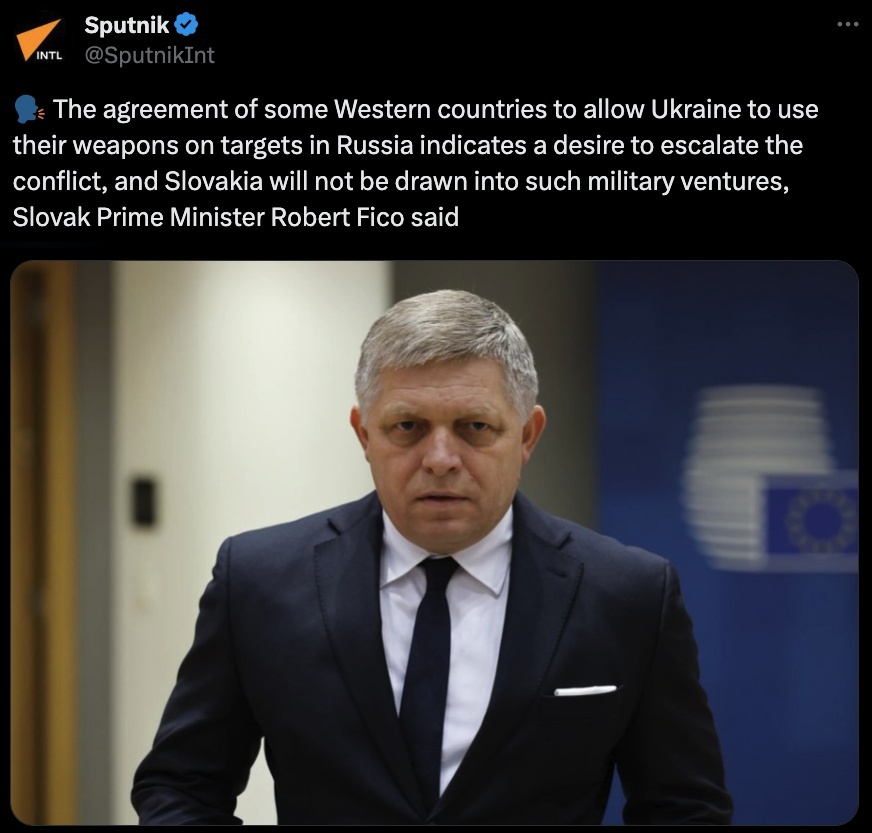 斯洛伐克總理菲佐日前也表示,西方國家允許烏克蘭使用西方武器襲擊俄羅斯本土目標(biāo),只能證明它們想要的不是和平,而是它們與俄羅斯緊張關(guān)系的升級(jí),斯洛伐克不會(huì)被拉入這樣的軍事冒險(xiǎn)。