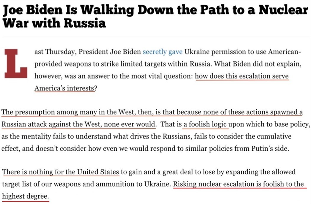 文章認(rèn)為,允許烏克蘭擴(kuò)大美援武器的打擊范圍對(duì)美國有百害而無一利。在美國安全并未受到威脅的情況下,冒險(xiǎn)與俄羅斯爆發(fā)核戰(zhàn)爭(zhēng)簡直“蠢透了”。
