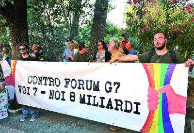 6月14日,在意大利法薩諾,抗議者打出“你們只有七個(gè),我們是八十億人”的標(biāo)語,批評七國集團(tuán)與世界完全割裂。新華社記者 李京攝