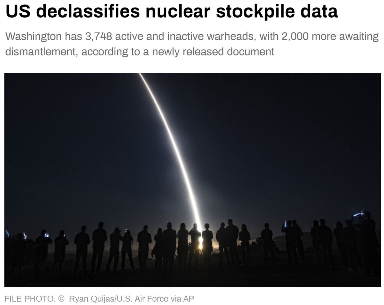 美國能源部下屬的國家核安全管理局近日表示,截至2023年9月,美國核武庫共有3748枚核彈頭。從1994財(cái)年到2023財(cái)年,美國銷毀了超過1.2萬枚核彈頭。另有2000枚核彈頭已經(jīng)淘汰并等待處置。