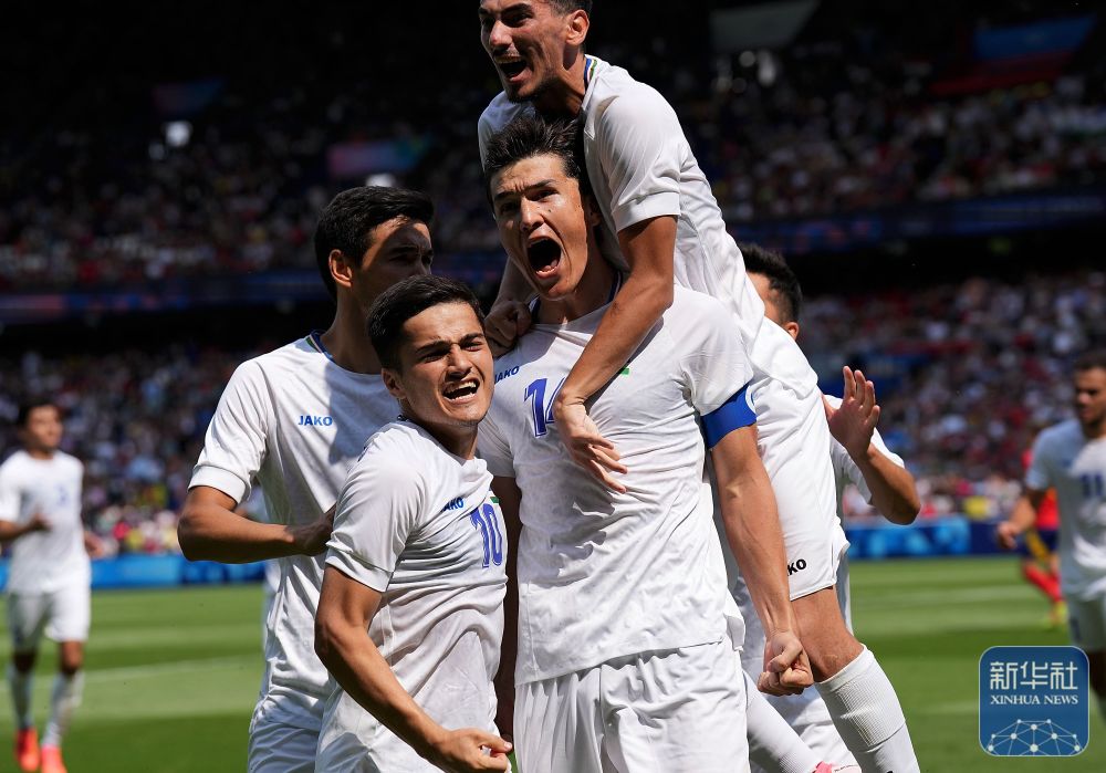 烏茲別克斯坦隊球員在比賽中慶祝進球。新華社記者 李一博 攝