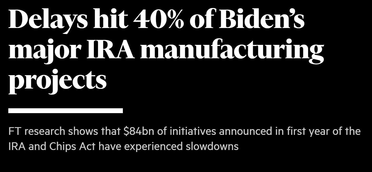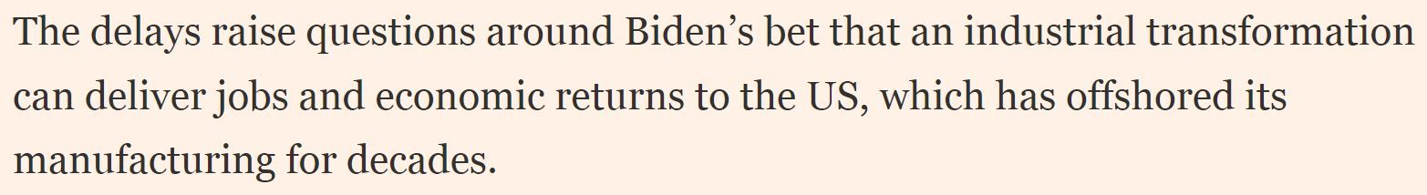 按照《金融時報》的說法,項目遲滯令輿論質(zhì)疑拜登政府所篤定的工業(yè)轉(zhuǎn)型有望為美國帶來就業(yè)和經(jīng)濟(jì)回報的說法。