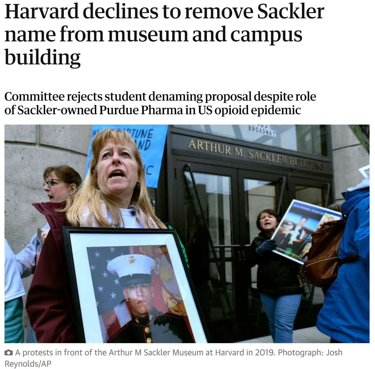 近日,美國(guó)哈佛大學(xué)拒絕了部分學(xué)生及有關(guān)方面提出的將“薩克勒”這一名字從哈佛大學(xué)博物館及其他校內(nèi)建筑上去除的要求,再次引發(fā)了人們對(duì)美國(guó)藥物成癮問題的關(guān)注。