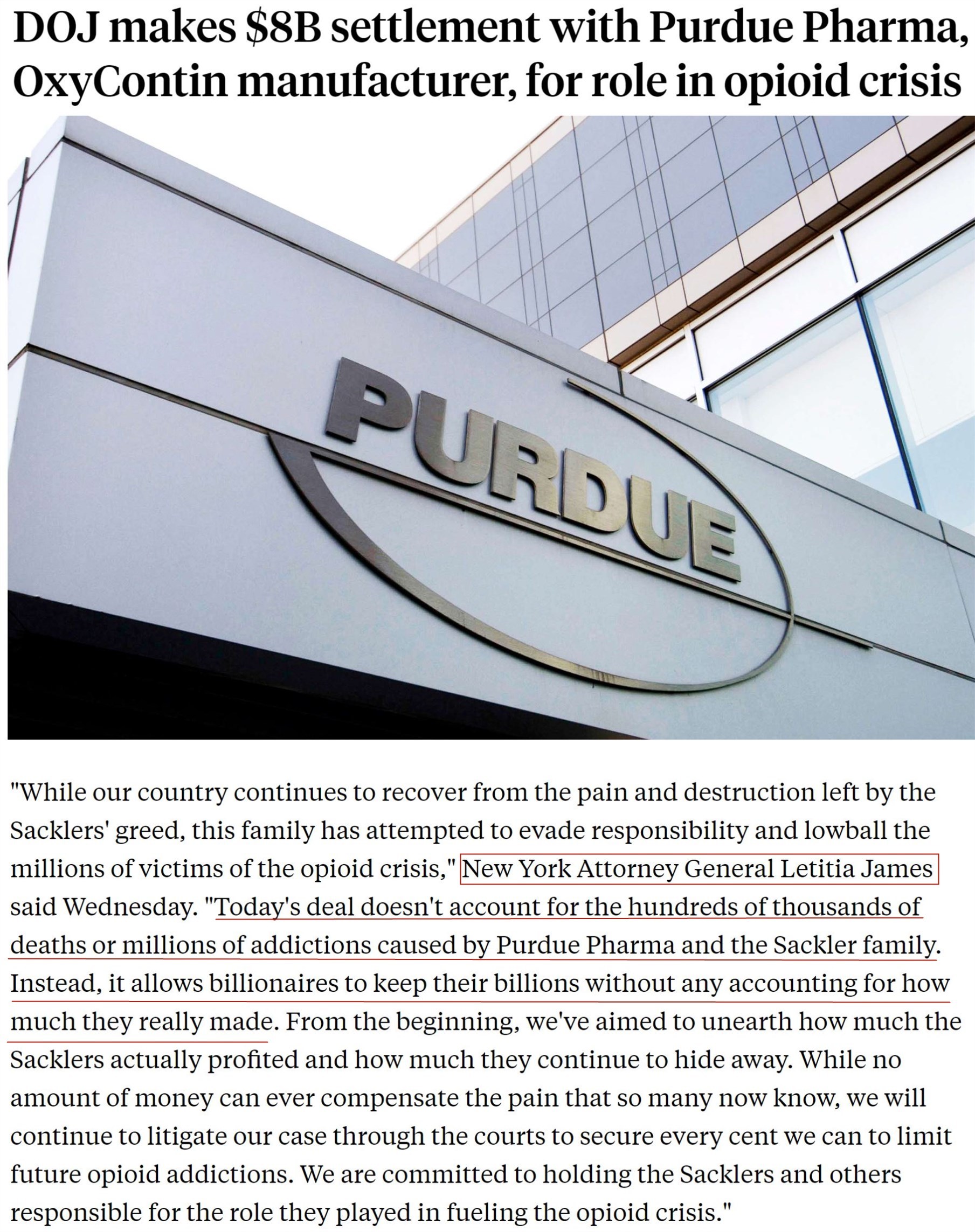 但紐約州總檢察長(zhǎng)利蒂希婭·詹姆斯發(fā)表聲明,批評(píng)司法部與普渡制藥公司達(dá)成的和解協(xié)議,表示“協(xié)議不能解決普渡制藥公司和薩克勒家族造成的數(shù)十萬人死亡以及數(shù)百萬人成癮的現(xiàn)實(shí)。相反,和解協(xié)議使億萬富翁可以保留其數(shù)十億美元的資產(chǎn)而無需為他們實(shí)際造成的傷害付出代價(jià)。”
