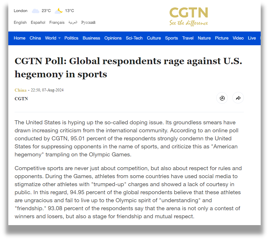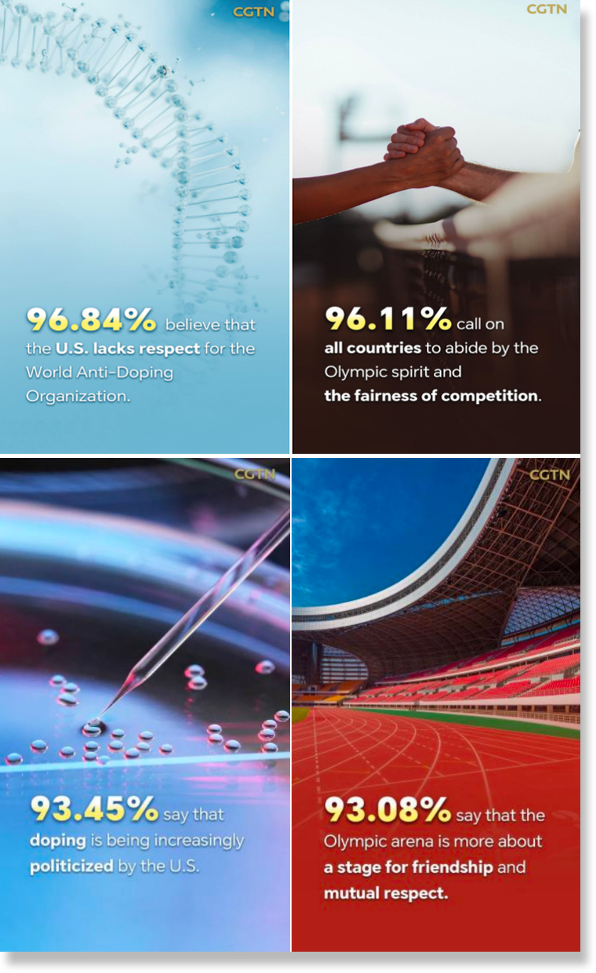 總臺(tái)CGTN先后兩次發(fā)起全球民調(diào),調(diào)查顯示,96.84%的受訪者認(rèn)為美方缺乏對(duì)世界反興奮劑機(jī)構(gòu)的尊重,是在挑戰(zhàn)公平和權(quán)威;96.25%的受訪者痛批美國在興奮劑監(jiān)管方面“雙重標(biāo)準(zhǔn)”;93.45%的受訪者表示,興奮劑問題日益被美國政治化和工具化;95.57%的受訪者認(rèn)為美國反興奮劑機(jī)構(gòu)或存包庇行為,為涉興奮劑的美國運(yùn)動(dòng)員開脫……