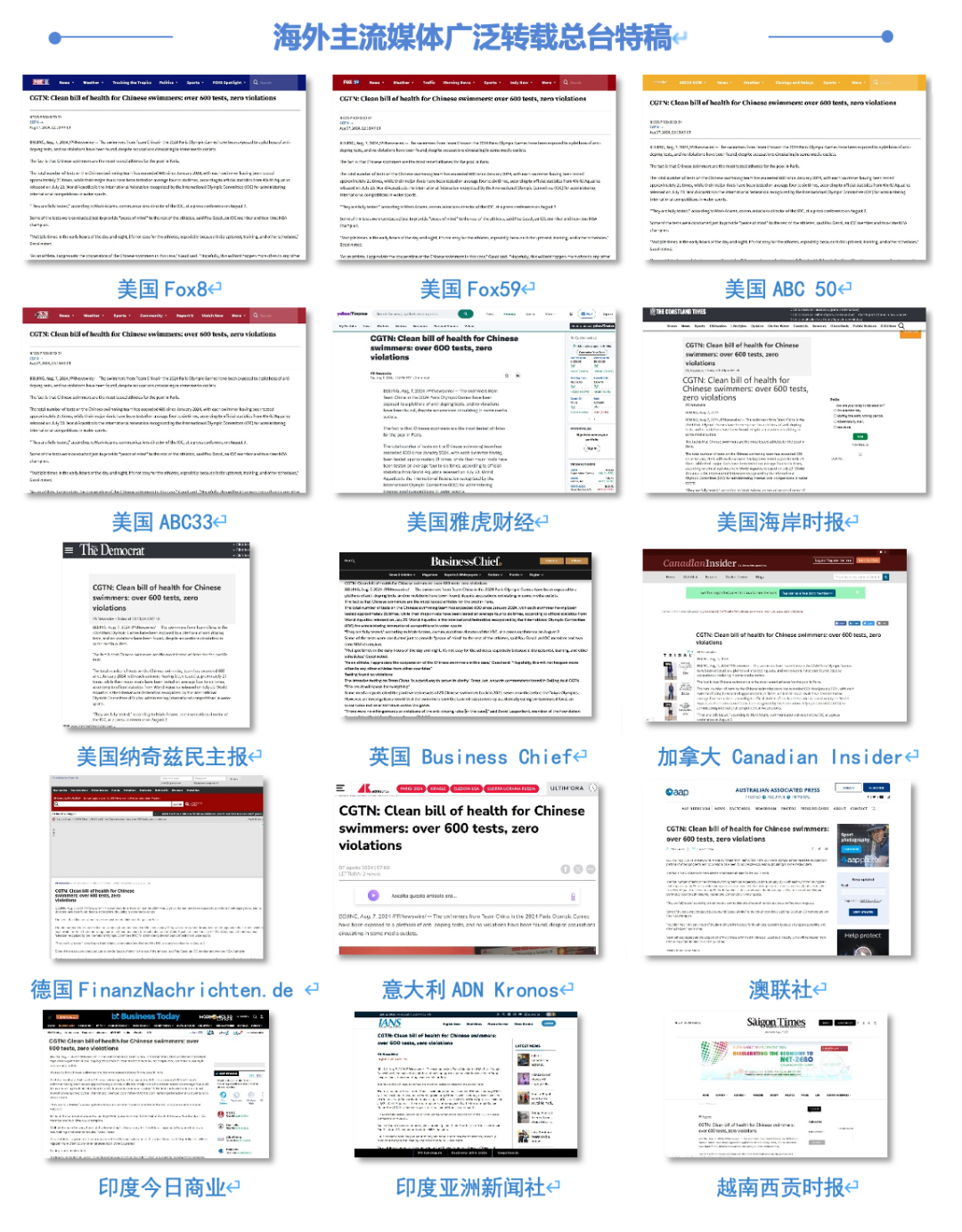 此外,多條重磅報(bào)道接連發(fā)出,直指美國在興奮劑問題上的霸道行徑及其危害,如《實(shí)錘!藥檢陽性不禁賽 世界反興奮劑機(jī)構(gòu)深度揭批美對(duì)違禁運(yùn)動(dòng)員操作內(nèi)幕》《干干凈凈比賽:中國游泳隊(duì)超600次藥檢,零違規(guī)》《美國濫施“長臂管轄”!反興奮劑“雙標(biāo)”何時(shí)休?》等。這些報(bào)道在多語種全平臺(tái)及時(shí)發(fā)布,獲海外主流媒體廣泛轉(zhuǎn)載,助力重樹全球運(yùn)動(dòng)員對(duì)公平競賽的信心。