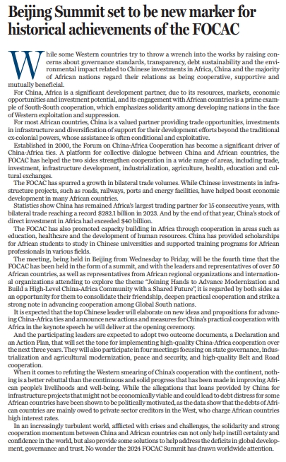 面對危機與挑戰(zhàn)增多、動蕩不安的當(dāng)今世界,中國與非洲國家間展現(xiàn)的團(tuán)結(jié)一致與強勁合作勢頭,不僅可以為世界注入更多確定性和信心,也可以為解決全球發(fā)展、治理和信任赤字提供方案。鑒于此,2024中非合作論壇峰會自然是全球矚目的焦點。