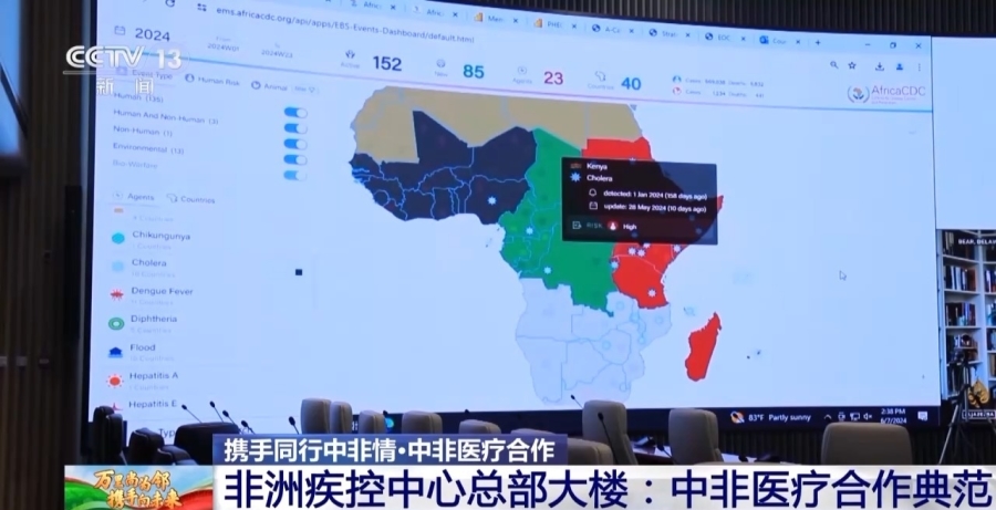 在位于非洲疾控中心八層的應(yīng)急指揮大廳里,巨大的顯示屏顯示著新型冠狀病毒、猴痘、埃博拉、登革熱等傳染病數(shù)據(jù),配套設(shè)置有數(shù)據(jù)采集系統(tǒng),可以讓疾病數(shù)據(jù)第一時間上傳到應(yīng)急指揮大廳,確保數(shù)據(jù)實時更新,為疾控決策提供依據(jù)。