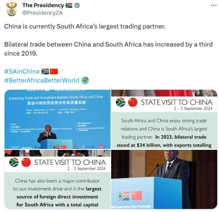 南非總統(tǒng)官方賬號(hào)也在峰會(huì)期間發(fā)文稱,中國(guó)目前是南非最大的貿(mào)易伙伴,南非和中國(guó)擁有充滿活力、多元和不斷增長(zhǎng)的經(jīng)濟(jì),能夠?yàn)橄M_(kāi)拓新市場(chǎng)的企業(yè)提供豐富機(jī)遇。
