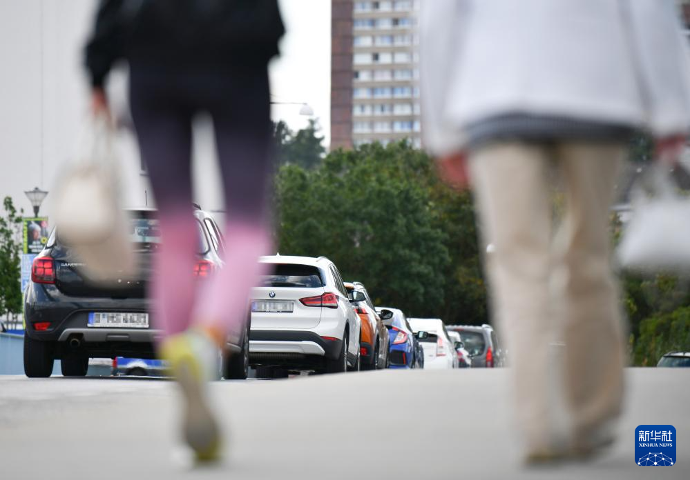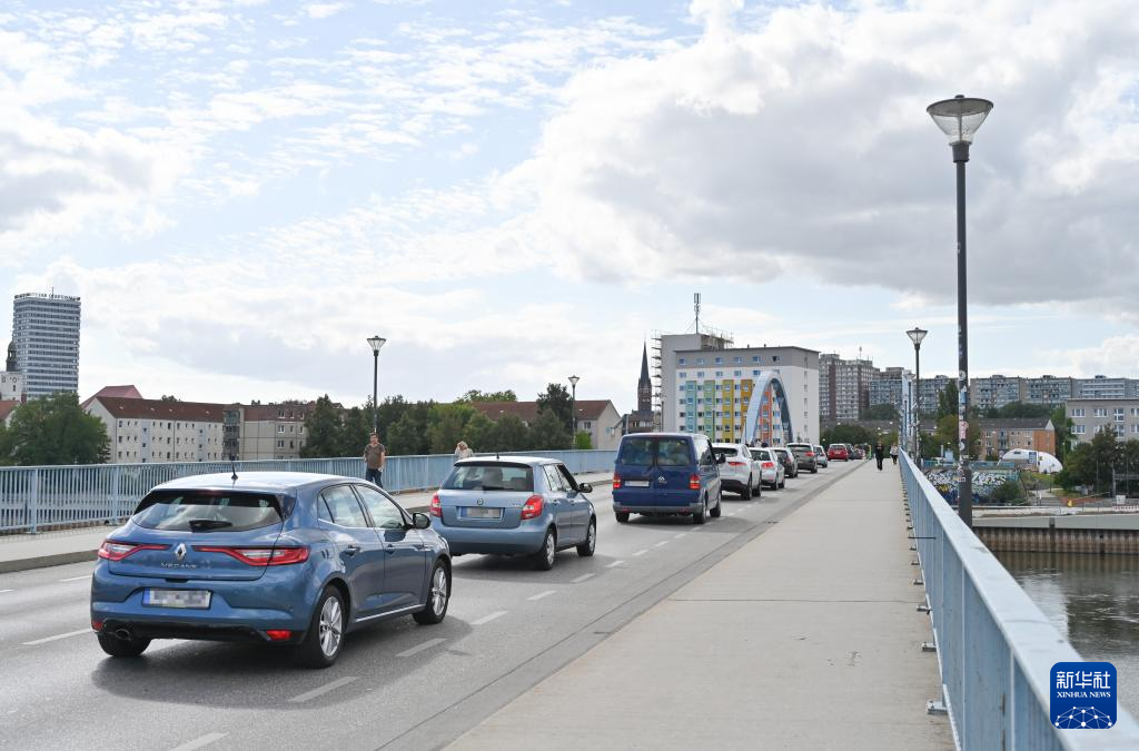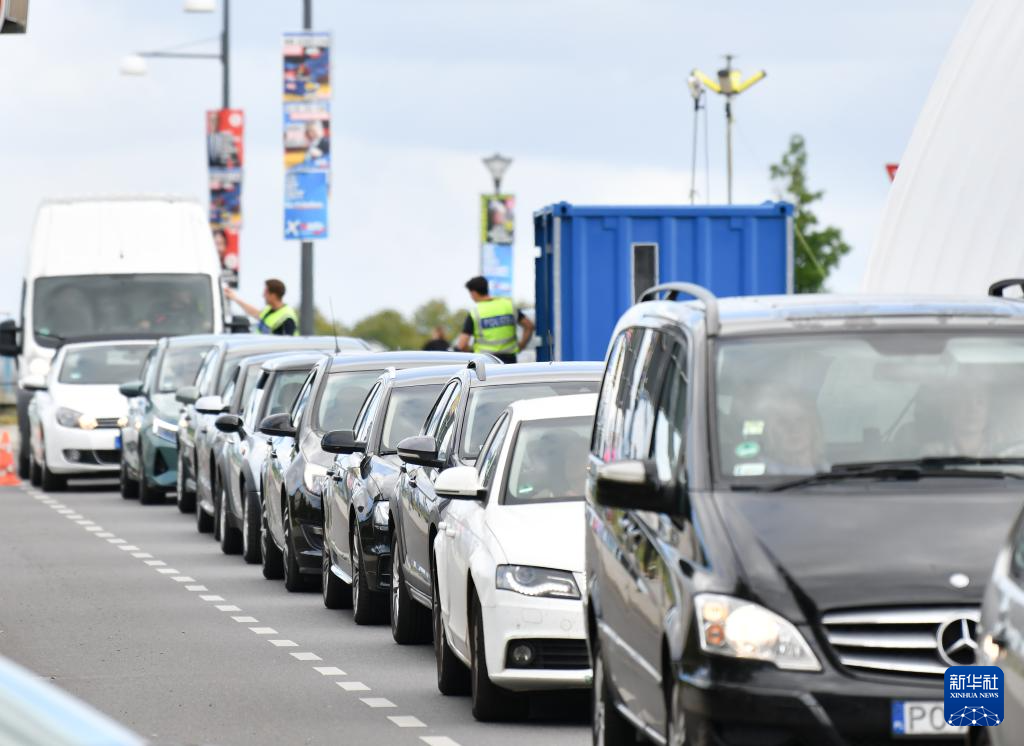 9月10日,車(chē)輛排隊(duì)通過(guò)德國(guó)奧得河畔法蘭克福和波蘭斯武比采邊境的檢查站。新華社記者 任鵬飛 攝