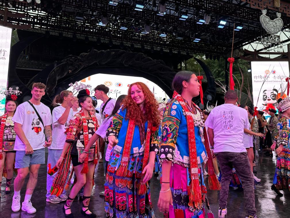 9月16日,美國(guó)青少年在貴州西江千戶(hù)苗寨體驗(yàn)苗族服飾及舞蹈。新華社記者 袁睿 攝
