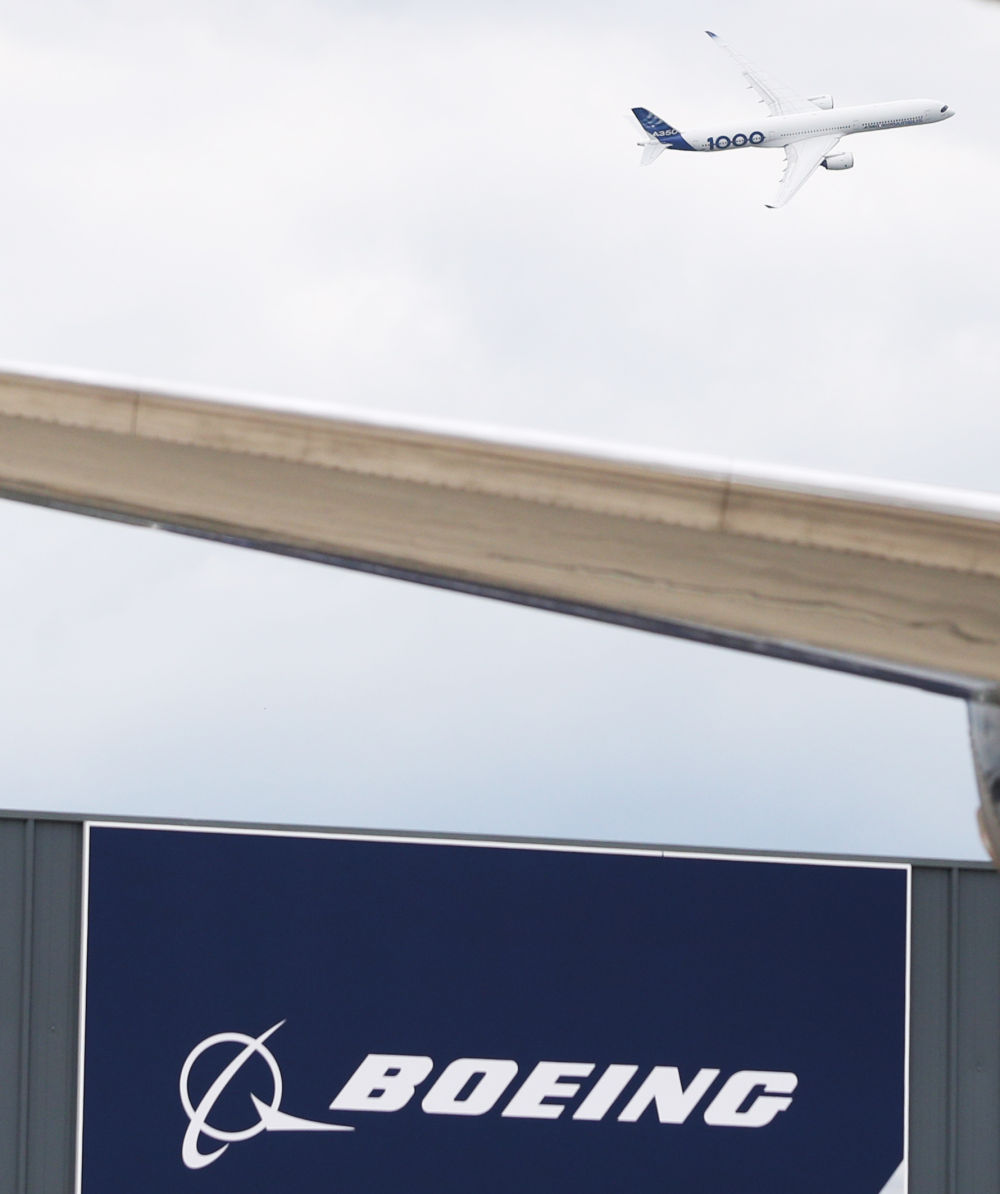2019年6月20日,在第53屆巴黎-布爾歇國際航空航天展覽會(巴黎航展)上,一架空客A350-1000飛機在進行飛行表演時從波音公司展示區(qū)域上空飛過。新華社記者高靜攝