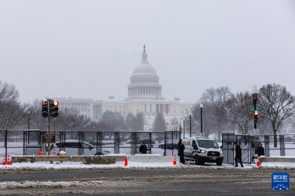 6日當(dāng)天,美國(guó)國(guó)會(huì)大廈周圍被高大的隔離欄環(huán)繞,安保措施顯著加強(qiáng)。