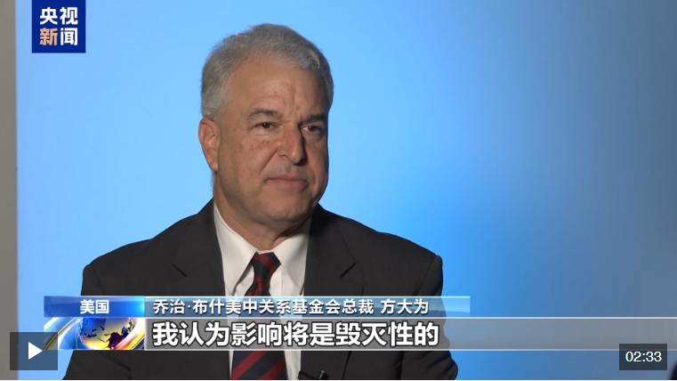 喬治·布什美中關(guān)系基金會(huì)總裁方大為6日在接受央視記者專訪時(shí)表示,美國(guó)政府新關(guān)稅政策的影響將是毀滅性的,不僅會(huì)使美國(guó)經(jīng)濟(jì)面臨更大的風(fēng)險(xiǎn),引發(fā)的經(jīng)濟(jì)衰退更是對(duì)全球貿(mào)易體系的破壞?!?