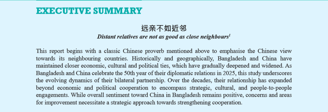 報(bào)告說,75%的受訪者對孟加拉國與中國的關(guān)系持正面看法,與此同時(shí),僅2%的受訪者對華關(guān)系持負(fù)面看法。