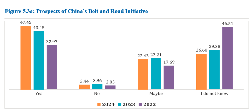 許多受訪者認(rèn)為中國的經(jīng)濟(jì)倡議,如共建“一帶一路”倡議,能夠推動(dòng)孟加拉國的增長。