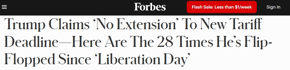 對于此次關(guān)稅調(diào)整,《福布斯》雜志網(wǎng)站7日報(bào)道指出,從今年2月7日首次公開提及對他國進(jìn)口商品征收全面關(guān)稅,到強(qiáng)調(diào)“2025年8月1日這一日期不會有任何延長”的這五個(gè)月里,特朗普政府在關(guān)稅問題上的態(tài)度“翻轉(zhuǎn)”了大約28次。