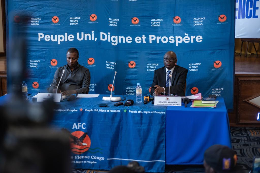 7月3日,剛果(金)反政府武裝“M23運(yùn)動”對話代表姆博寧帕(右)出席在戈馬舉行的記者會。新華社發(fā)(扎內(nèi)姆·內(nèi)蒂·扎伊迪攝)