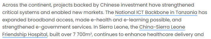 文章說,中國在非洲投資支持的項目夯實了關(guān)鍵系統(tǒng)根基,催生了新興市場。文章舉例說,坦桑尼亞的國家信息通信技術(shù)寬帶骨干網(wǎng)項目顯著拓寬了寬帶覆蓋范圍,讓線上醫(yī)療和線上學(xué)習(xí)成為可能,并強化了電子政務(wù)服務(wù)體系;塞拉利昂的中塞友好醫(yī)院持續(xù)提升當(dāng)?shù)氐尼t(yī)療服務(wù)水平,在抗擊埃博拉疫情期間發(fā)揮了關(guān)鍵作用……文章說,這些項目的故事或許不會成為西方媒體的頭條新聞,但它們實實在在提振了市場,培養(yǎng)了勞動技能,為非洲企業(yè)的蓬勃發(fā)展創(chuàng)造了條件。