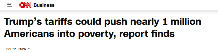 美國(guó)有線電視新聞網(wǎng)(CNN)11日?qǐng)?bào)道指出,特朗普政府的關(guān)稅政策在推高聯(lián)邦收入的同時(shí),恐導(dǎo)致顯著的社會(huì)成本。耶魯大學(xué)預(yù)算實(shí)驗(yàn)室最新分析顯示,這一系列政策或使近百萬美國(guó)人陷入貧困。