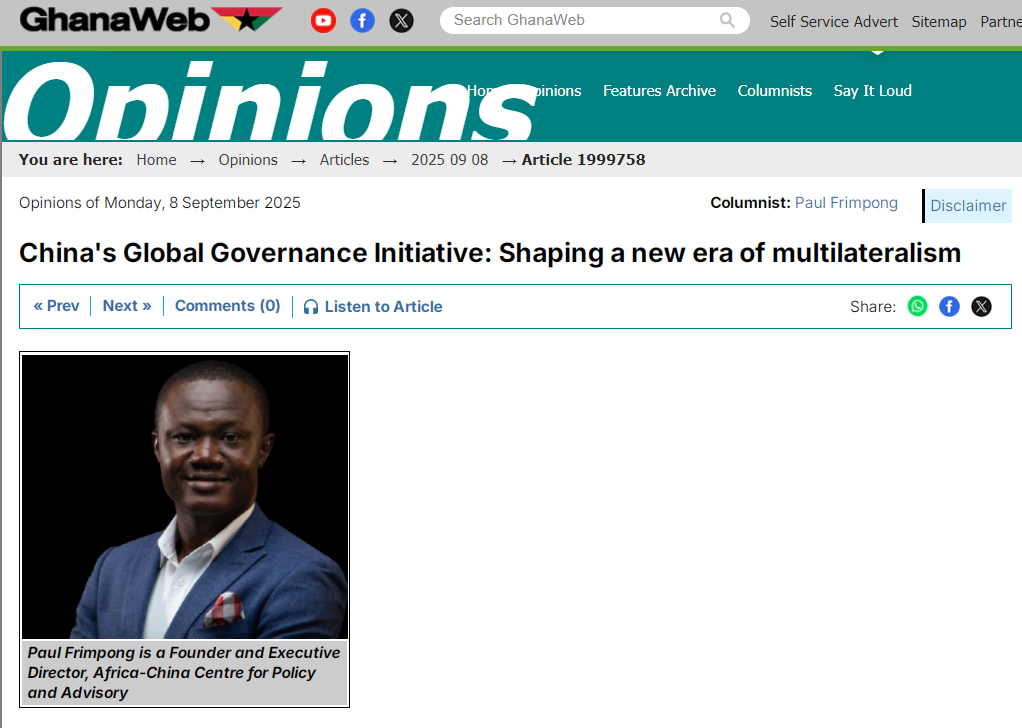 加納新聞網(wǎng)站“Ghana Web”9月8日刊發(fā)加納非中政策咨詢中心執(zhí)行主任保羅·弗林蓬的署名文章《中國(guó)全球治理倡議:塑造多邊主義新時(shí)代》,對(duì)中國(guó)提出的全球治理倡議予以高度評(píng)價(jià)。