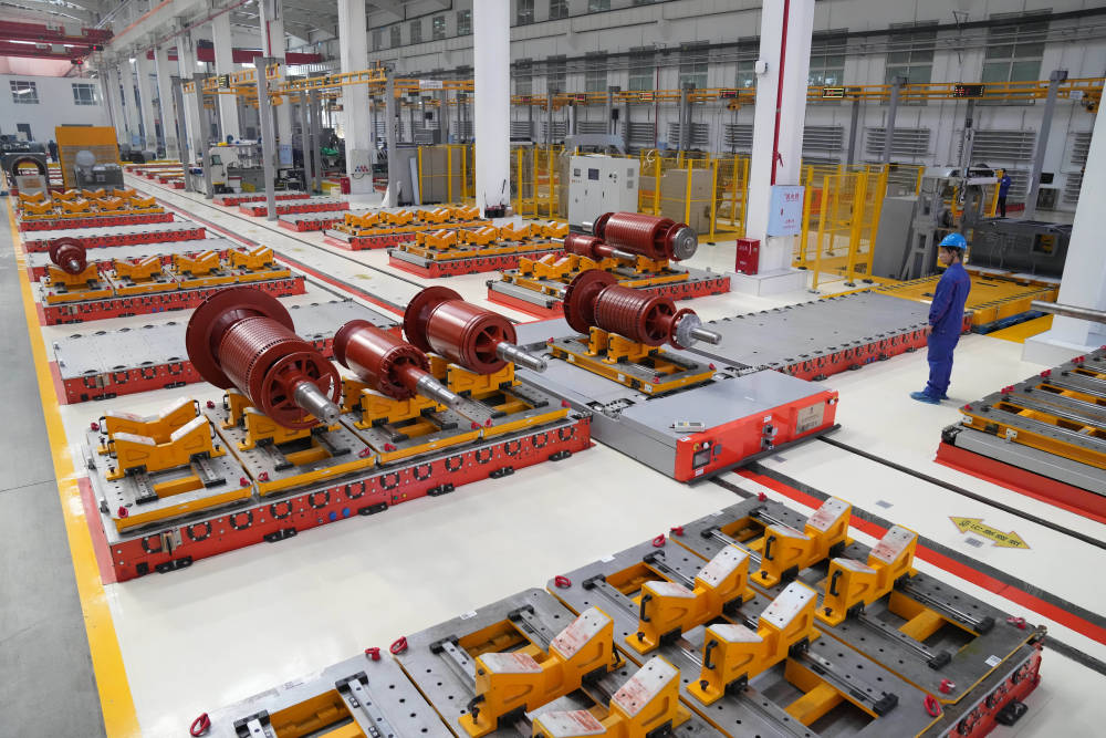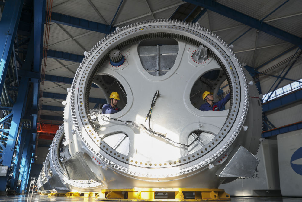 2024年3月5日,在位于黑龍江省齊齊哈爾市的中國(guó)一重集團(tuán)有限公司風(fēng)電裝備生產(chǎn)制造廠(chǎng)生產(chǎn)車(chē)間,工作人員在組裝設(shè)備。新華社記者 張濤 攝