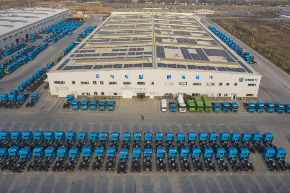 這是在位于山西省晉中市榆次區(qū)的山西新能源汽車工業(yè)有限公司(吉利晉中基地)拍攝的甲醇重卡(4月1日攝,無人機照片)。新華社記者 楊晨光 攝
