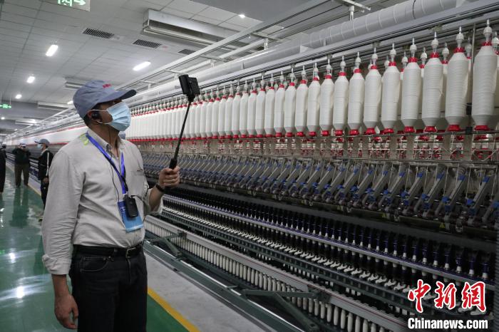 4月13日,外國媒體人參觀拍攝新疆尉犁縣利華紡織有限公司紡紗廠工作情況。 徐雪瑩 攝