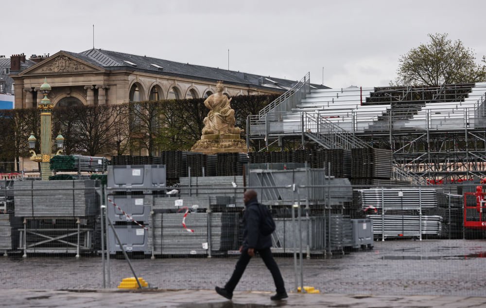 4月2日,行人經(jīng)過(guò)法國(guó)巴黎協(xié)和廣場(chǎng)的奧運(yùn)比賽場(chǎng)地和看臺(tái)建設(shè)工地。新華社記者 高靜 攝