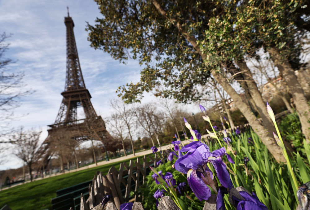 3月20日,法國(guó)巴黎埃菲爾鐵塔下春花綻放。新華社記者 高靜 攝