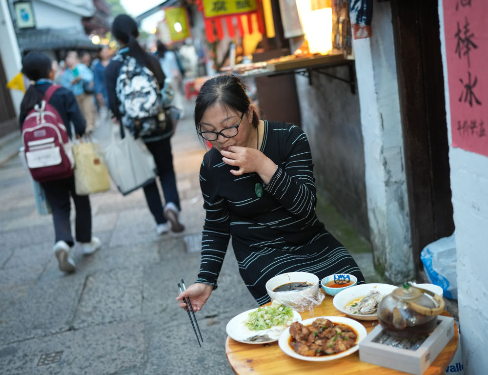 浙江紹興倉(cāng)橋直街,人來(lái)客往。傍晚,居民童秀娟把小飯桌搬到家門(mén)口,倚街而坐,拈起一只醉蝦嘬起來(lái)。尋常煙火味,彌散開(kāi)來(lái)。