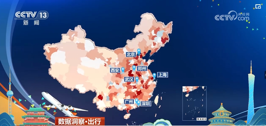 這是一張根據(jù)12306火車票預(yù)售數(shù)據(jù)繪制的熱力圖,紅色越深代表在5月1日乘火車凈流入到這個城市的人越多,藍色越深則表示凈流出這里的人越多??梢钥吹剑鄙蠌V深、武漢、鄭州、西安等中心城市是凈流出人數(shù)較多的城市。