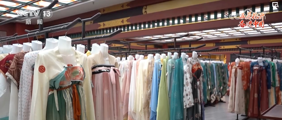 看起來對漢服造型頗有研究的胡芯銀今年只有24歲。胡芯銀介紹,也就是在這幾年,隨著大家對傳統(tǒng)文化的喜愛,西安的漢服館如雨后春筍般涌現(xiàn)。感受到“漢服熱”的胡芯銀在2022年初,辭去了原先婚禮跟妝的工作,應聘到了這家位于長安十二時辰主題街區(qū)附近的漢服館,擔任漢服造型師。