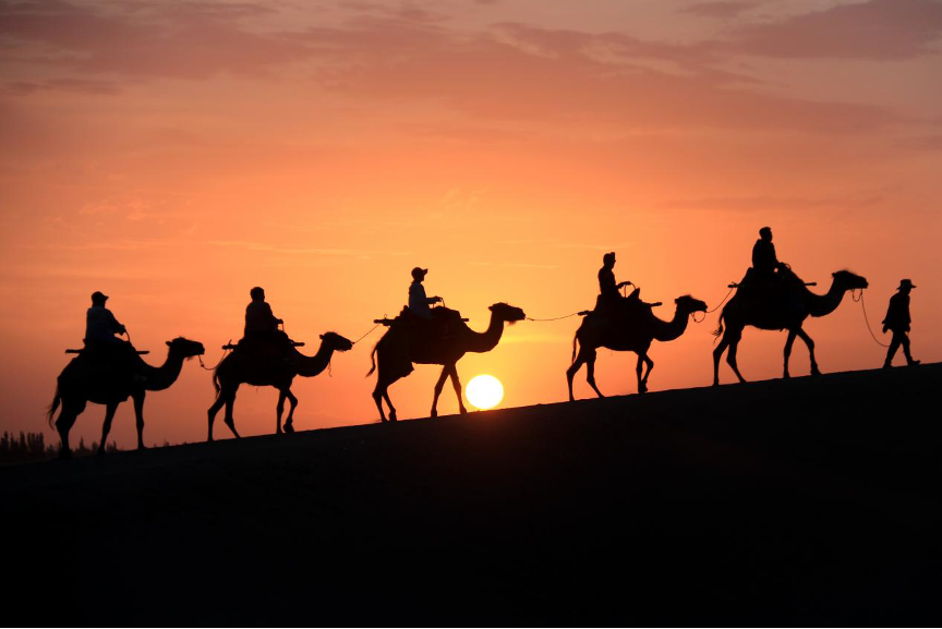 清晨,游客在甘肅省敦煌市鳴沙山月牙泉景區(qū)游覽。新華社發(fā)(張曉亮 攝)
