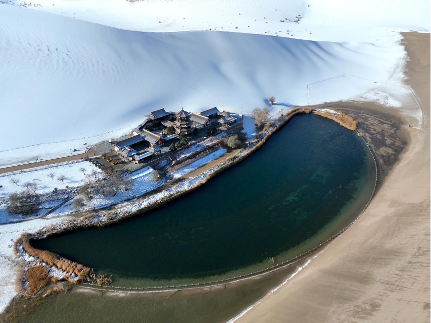 敦煌鳴沙山月牙泉景區(qū)雪景(無人機照片)。新華社發(fā)(張曉亮 攝)