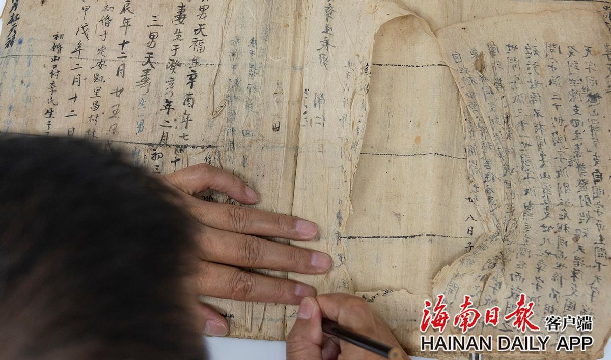 黃文鋒在查看古籍紙張破損情況。海南日報(bào)記者袁琛 攝