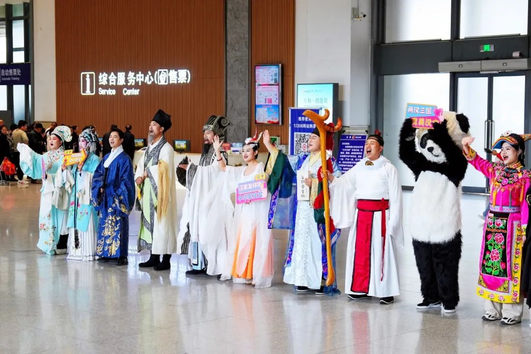 西安局集團(tuán)公司與地方文旅局對(duì)接,組織張騫、劉邦、蔡倫等歷史文化名人及秦嶺四寶人偶、非遺漢調(diào)桄桄戲和羌族服飾演員組成的文旅IP在漢中站開展特色迎賓活動(dòng),在互動(dòng)中引導(dǎo)旅客文明出行,展示地域文化。