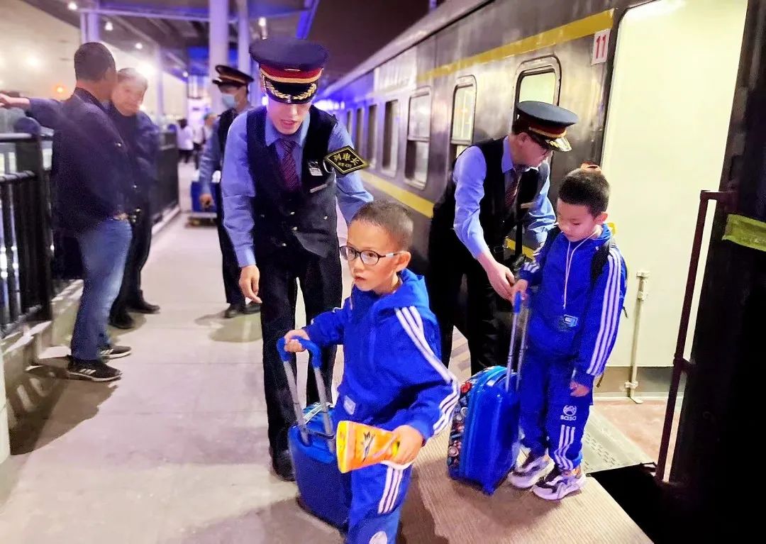 在吐魯番站,一群可愛的小學(xué)生在老師們的帶領(lǐng)下有序登上7557次列車,列車長(zhǎng)蔣耀和乘務(wù)員西爾扎提·居來提在11號(hào)車廂門口幫孩子們把藍(lán)色行李箱提上車。
