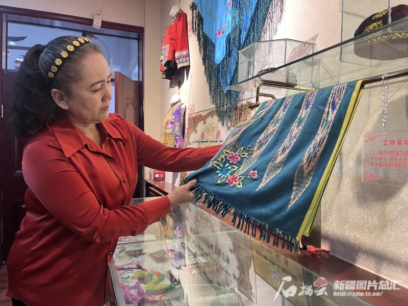 哈密刺繡國家級代表性傳承人阿加汗·賽買提家,不僅有刺繡工廠,還有一個展示哈密刺繡的展廳。石榴云/新疆日報記者 王晶晶攝