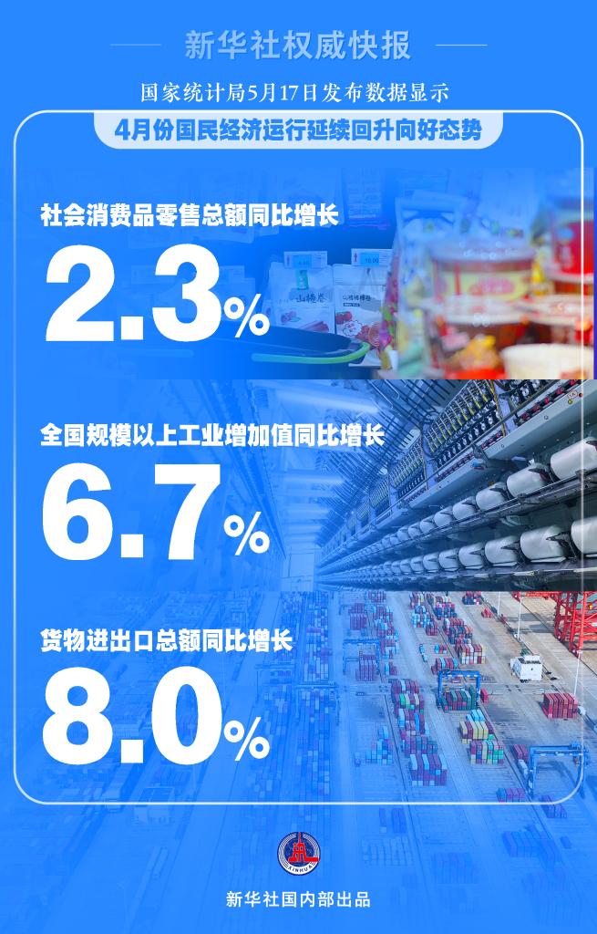 國家統(tǒng)計局17日發(fā)布的數(shù)據(jù)顯示,今年4月份,生產(chǎn)需求平穩(wěn)增長,就業(yè)物價總體向好,社會預期持續(xù)改善,高質(zhì)量發(fā)展扎實推進,國民經(jīng)濟運行總體穩(wěn)定,延續(xù)回升向好態(tài)勢。