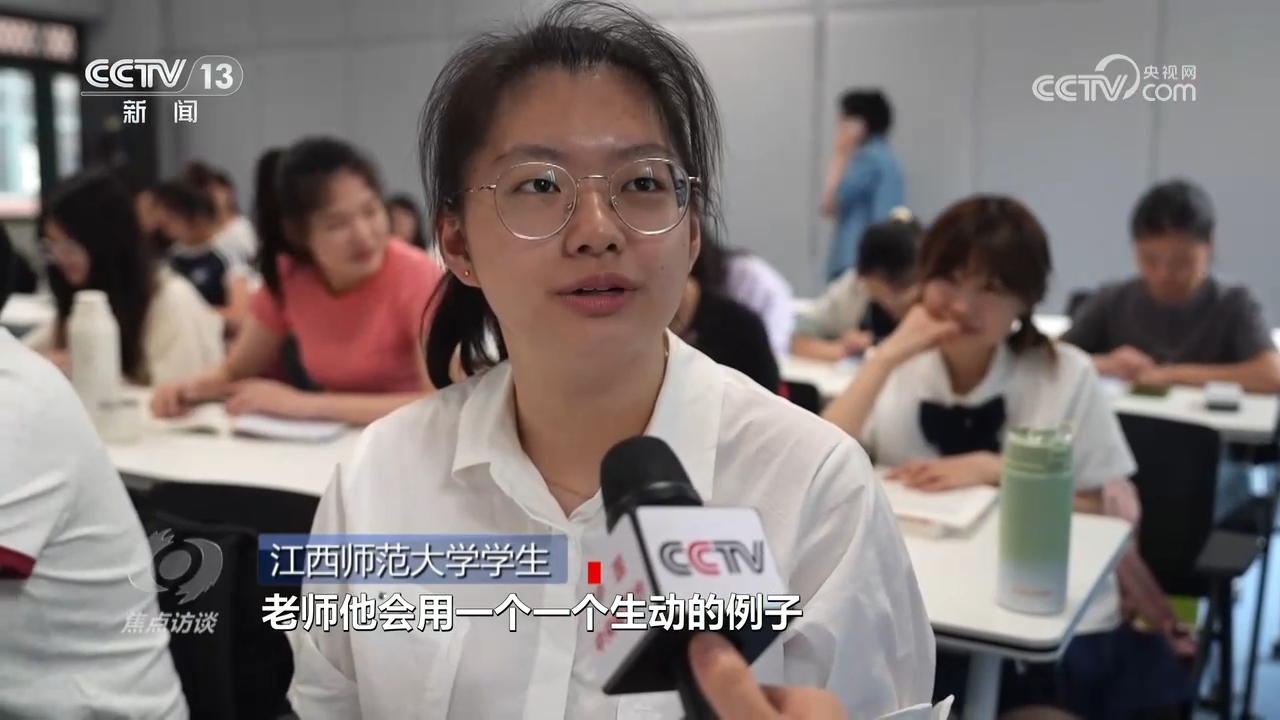 江西師范大學(xué)學(xué)生:“老師他會(huì)用一個(gè)生動(dòng)的例子來(lái)表達(dá)他的觀點(diǎn),然后也會(huì)用一些讓人感覺很熱血沸騰的,也有那種催人眼淚的故事,然后來(lái)激蕩我的心靈?!?/p>