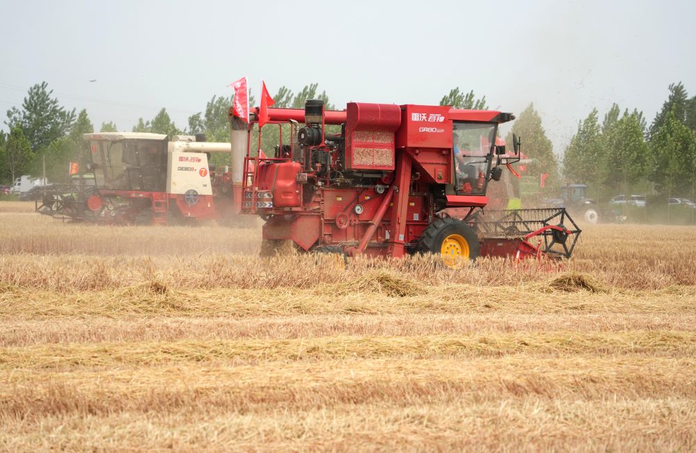 這是2日上午,位于臨沂市郯城縣廟山鎮(zhèn)的山東省“三夏”生產(chǎn)開機(jī)暨小麥機(jī)收減損技能大比武啟動儀式的現(xiàn)場情景。自此,山東6000多萬畝小麥將自南向北、自西向東陸續(xù)集中收獲。預(yù)計“三夏”期間,全省上陣150萬臺套農(nóng)業(yè)機(jī)械;其中,小麥聯(lián)合收割機(jī)20萬臺、玉米播種機(jī)23萬臺。