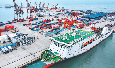 今年以來,山東省榮成市石島管理區(qū)通過推廣“海運直航+跨境電商+海外倉”等發(fā)展模式,全力做好貨物承攬。圖為日前,石島新港口岸,貨輪在裝卸集裝箱貨物。
