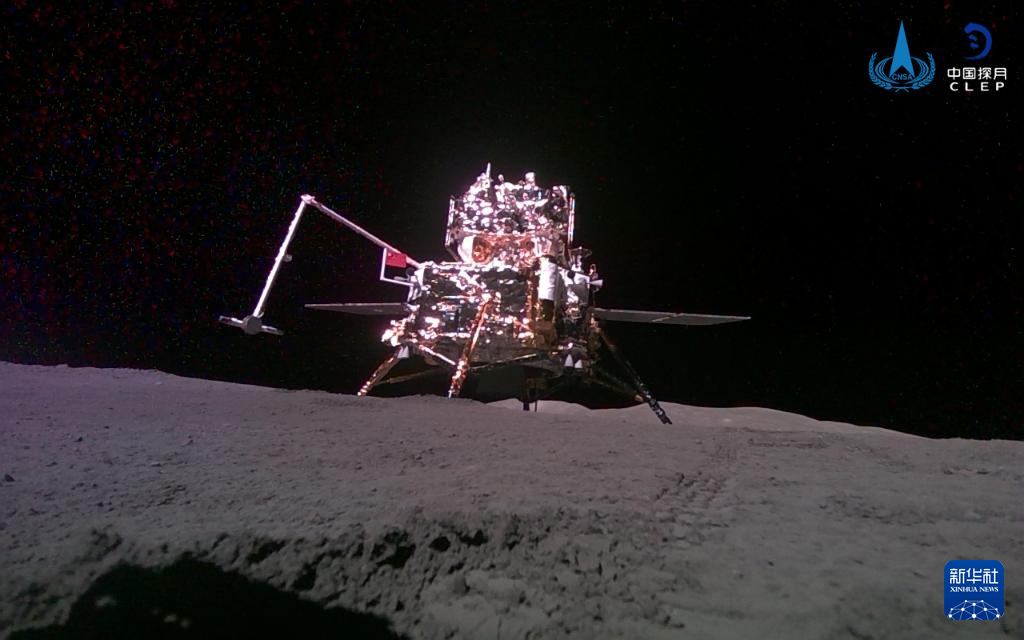 6月3日,嫦娥六號(hào)攜帶的“移動(dòng)相機(jī)”自主移動(dòng)后拍攝并回傳的著陸器和上升器合影。新華社發(fā)(國(guó)家航天局供圖)