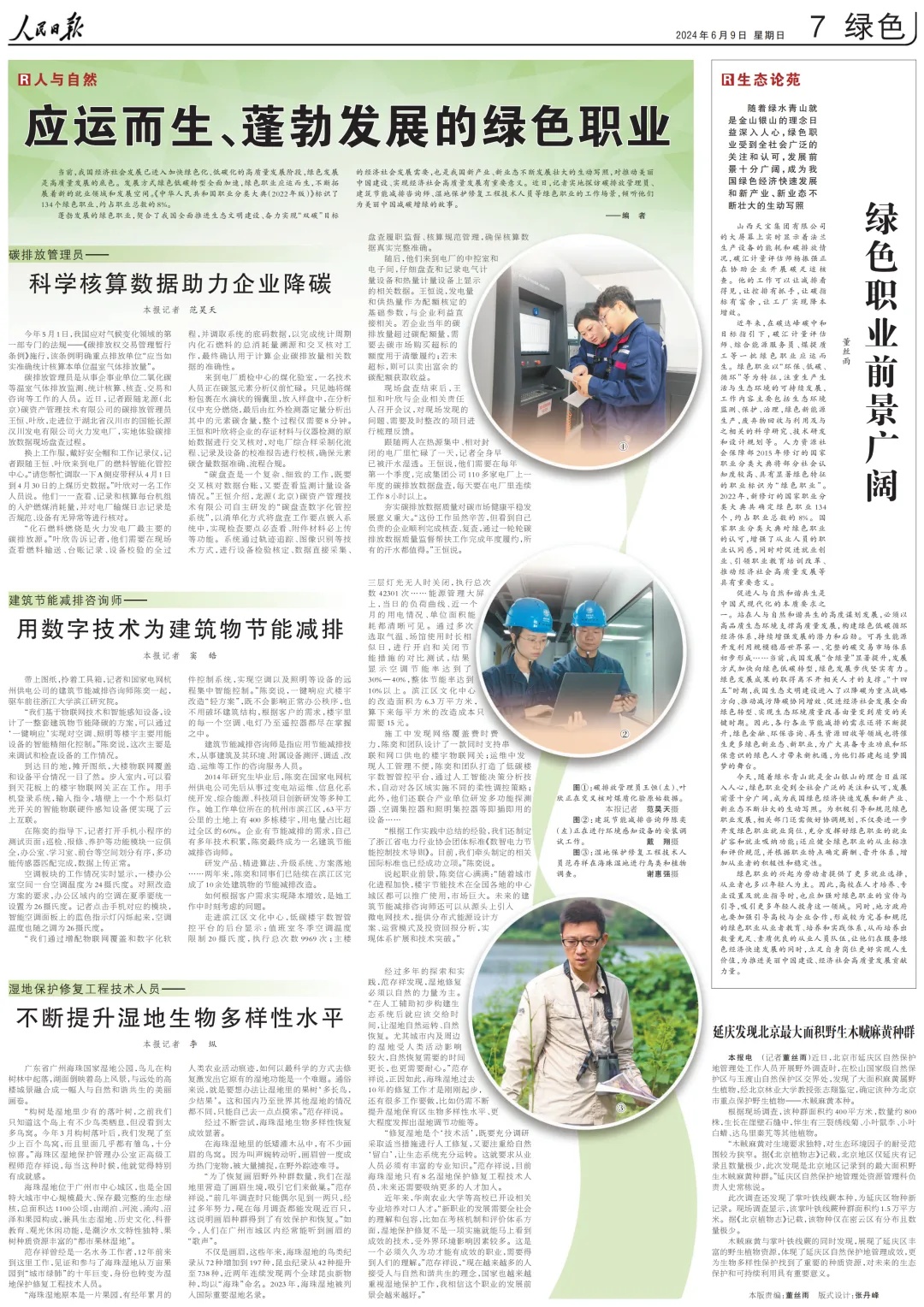蓬勃發(fā)展的綠色職業(yè),契合了我國(guó)全面推進(jìn)生態(tài)文明建設(shè)、奮力實(shí)現(xiàn)“雙碳”目標(biāo)的經(jīng)濟(jì)社會(huì)發(fā)展需要,也是我國(guó)新產(chǎn)業(yè)、新業(yè)態(tài)不斷發(fā)展壯大的生動(dòng)寫照,對(duì)推動(dòng)美麗中國(guó)建設(shè)、實(shí)現(xiàn)經(jīng)濟(jì)社會(huì)高質(zhì)量發(fā)展有重要意義。近日,人民日?qǐng)?bào)記者實(shí)地探訪碳排放管理員、建筑節(jié)能減排咨詢師、濕地保護(hù)修復(fù)工程技術(shù)人員等綠色職業(yè)的工作場(chǎng)景,傾聽(tīng)他們?yōu)槊利愔袊?guó)減碳增綠的故事。
