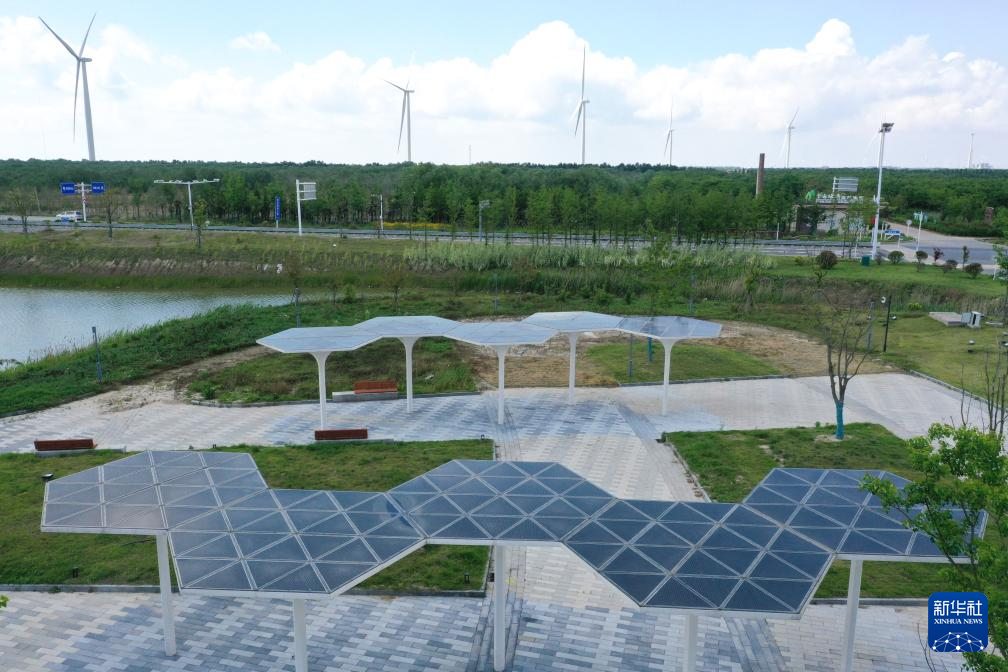 6月6日拍攝的射陽港低(零)碳產(chǎn)業(yè)研究院建筑屋頂使用的太陽能光伏電能系統(tǒng)(無人機照片)。新華社記者 楊磊 攝