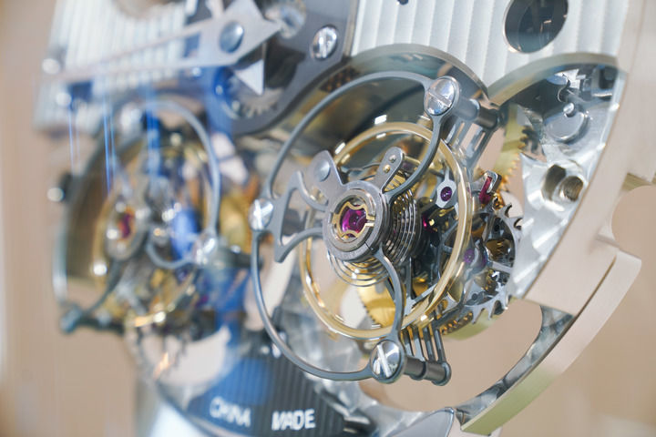 在位于遼寧丹東的孔雀表業(yè)(集團)有限公司展示中心拍攝的雙陀飛輪機芯模型(6月18日攝)。新華社記者 樊雨晴 攝